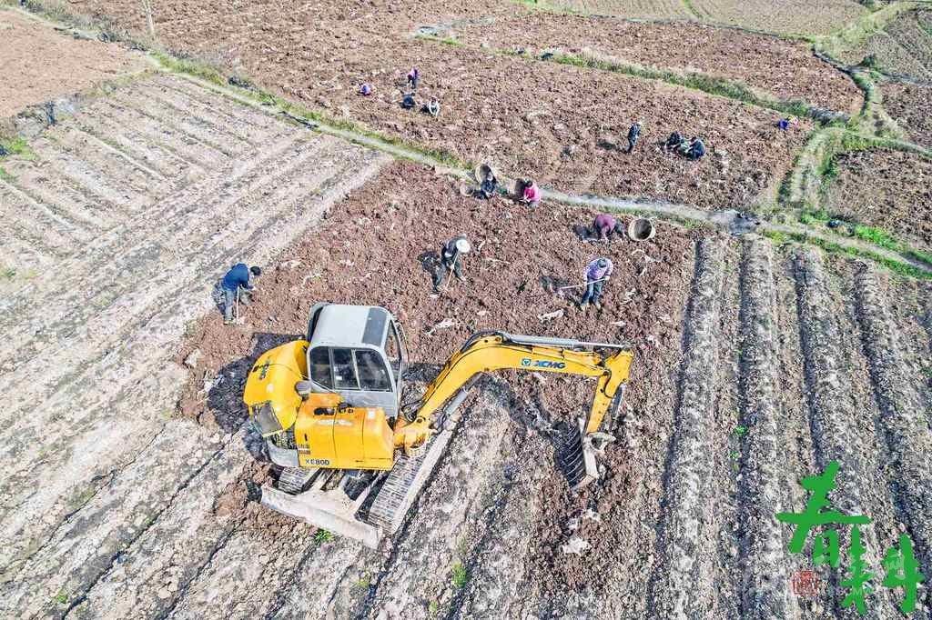 閬中市彭城鎮(zhèn)五谷臺村,機械正在菜地里開溝起壟施底肥,村民在播種蓋土。