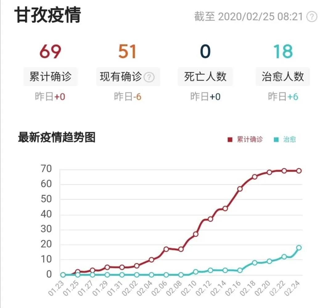 截止2月24日24時,我州累計報告新型冠狀病毒肺炎確診病例69例(道孚64例、康定2例、色達2例、稻城1例),其中累計治愈出院18例(道孚縣13例、康定市2例、色達縣2例、稻城縣1例),在治重癥5例,危重癥1例,其余患者病情穩(wěn)定,均在定點醫(yī)院接受治療。其中,男性39例,女性30例,最大的77歲,最小的3歲。累計確診病例中:5人有武漢旅居史,1人從雅安返回,2人從成都返回,1人從西藏返回、60人為道孚縣常住人口。尚在接受隔離醫(yī)學(xué)觀察的密切接觸者341人。各縣(市)確診病例情況表