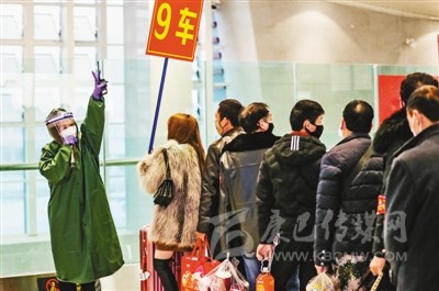 為在疫情期間幫助外出務(wù)工人員安全、順利返崗就業(yè),宜賓市先后采用專列、包車、包機等多種方式免費運送務(wù)工人員前往省內(nèi)外各地市。圖為當日宜賓西站客運員引導外出務(wù)工人員有序登車。
