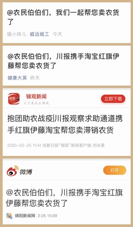多地市州媒體及縣級融媒體中心的關(guān)注積極響應(yīng)參與活動?!熬W(wǎng)信四川”公眾號、南充日報(bào)“南充見”、成都日報(bào)錦觀、眉山在線、開江發(fā)布、直播鹽亭、綿陽新聞網(wǎng)、宜賓日報(bào)、威遠(yuǎn)組工、健康大英等均及時對活動相關(guān)信息進(jìn)行了發(fā)布,及時把抱團(tuán)助農(nóng)戰(zhàn)疫活動信息帶給當(dāng)?shù)赜行枨蟮霓r(nóng)戶。