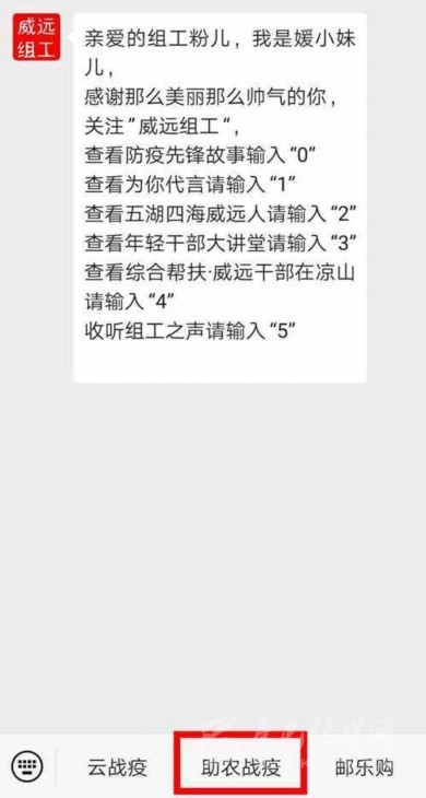 除了媒體之外,一些機(jī)關(guān)單位的政務(wù)新媒體也為活動“站臺”,“威遠(yuǎn)組工”官方微信公眾號的底部菜單欄,特別新增了“助農(nóng)戰(zhàn)疫”專欄,直接連通川報(bào)觀察頁面,為當(dāng)?shù)剞r(nóng)戶及農(nóng)業(yè)經(jīng)營戶提供解決難題的路徑。