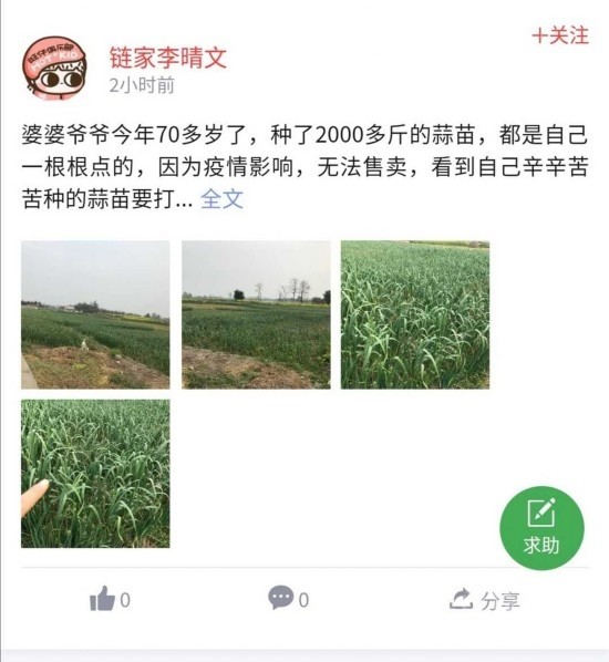 “婆婆爺爺今年70多歲了,種了2000多斤的蒜苗,都是自己一根根點(diǎn)的,因?yàn)橐咔橛绊?,無法售賣,看到自己辛辛苦苦種的蒜苗要打水漂,兩個老人都要急哭了?!奔易〕啥寂碇菔械睦钚〗阃ㄟ^“抱團(tuán)助農(nóng)戰(zhàn)疫”平臺求助表示,希望能夠幫忙盡快處理這些蒜苗。