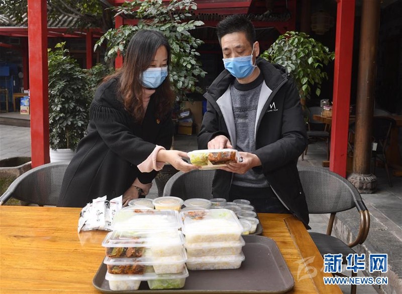 “女子服務(wù)隊(duì)”工作人員沈娜(左)向成都市金牛區(qū)“寇家大院”餐廳執(zhí)行店長(zhǎng)陳心華了解盒飯配送情況(2月28日攝)。新華社記者 劉坤 攝