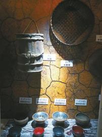 三河村村史館內(nèi)陳列的吊鍋、石磨和彝族漆器等生活用具。