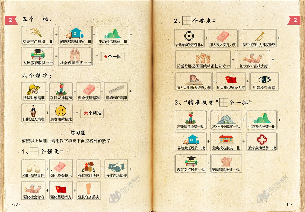 四川新聞網(wǎng)成都8月26日訊 又是周三啦?說好的脫貧攻堅(jiān)小課堂如期而至!目前,打贏脫貧攻堅(jiān)戰(zhàn)進(jìn)入最后沖刺的關(guān)鍵階段,四川還有很多硬仗要打,很多“硬骨頭”要啃,防止返貧致貧任務(wù)繁重,脫貧攻堅(jiān)工作力度還需要加強(qiáng),面臨的困難和挑戰(zhàn)依然十分艱巨。為了深入推進(jìn)精準(zhǔn)扶貧精準(zhǔn)脫貧,奪取全省脫貧攻堅(jiān)收官之戰(zhàn)全面勝利,本課采用上一課剛剛學(xué)到的數(shù)字來總結(jié)歸納了脫貧攻堅(jiān)政策和方法的關(guān)鍵知識(shí)點(diǎn),以便讓廣大同學(xué)進(jìn)一步掌握這些政策、運(yùn)用這些方法,提高政策受益覆蓋面及知曉率,確保各項(xiàng)政策落到實(shí)處。