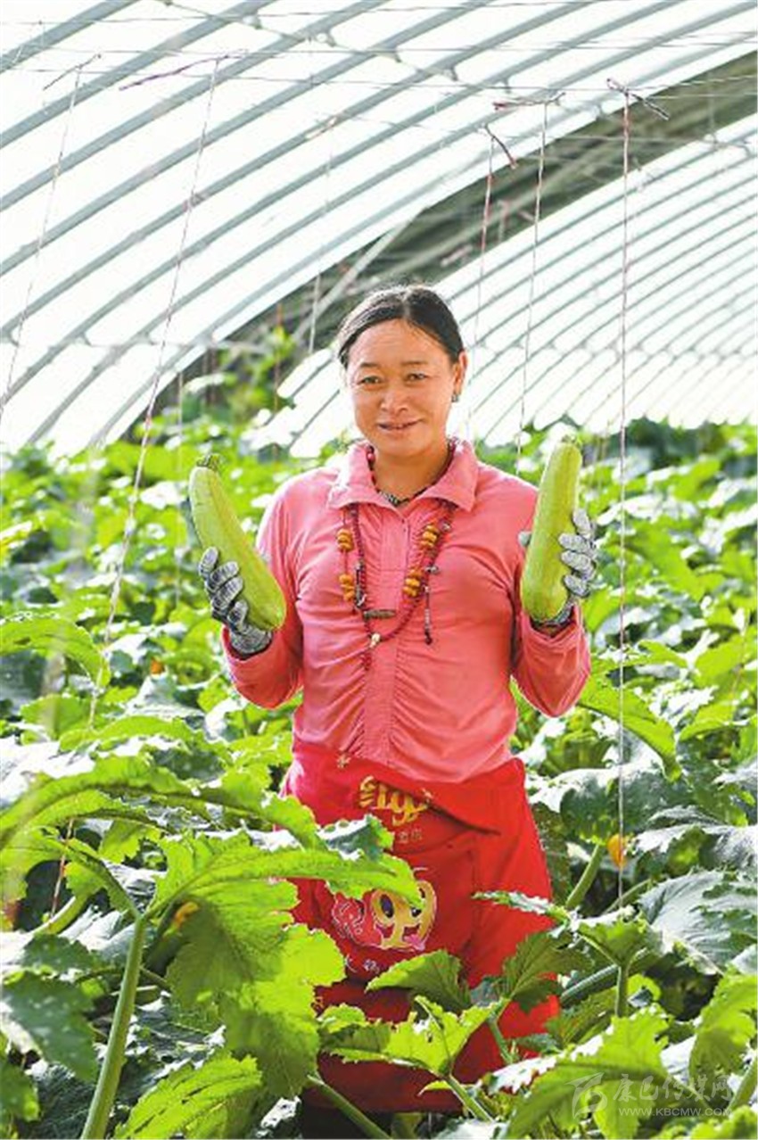 近日,在鄧瑪農(nóng)業(yè)觀光產(chǎn)業(yè)科技示范園內(nèi)工作的村民展示剛摘下的西葫蘆。 四川日報全媒體記者 楊樹 攝