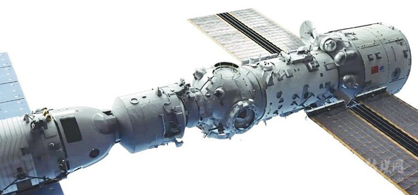 ●飛船成功對接天和核心艙前向端口,與此前已對接的天舟二號貨運飛船一起構(gòu)成三艙(船)組合體