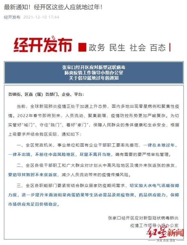 12月9日,河北張家口經(jīng)開(kāi)區(qū)也發(fā)出通知:全區(qū)黨政機(jī)關(guān)職工等就地過(guò)年。通知中倡導(dǎo):全區(qū)黨政機(jī)關(guān)、事業(yè)單位和國(guó)有企業(yè)干部職工要率先垂范,一律在本地過(guò)年,一律不出境,不前往中高風(fēng)險(xiǎn)地區(qū),盡量不離開(kāi)當(dāng)?shù)兀_有需要的要嚴(yán)格審批管理。
