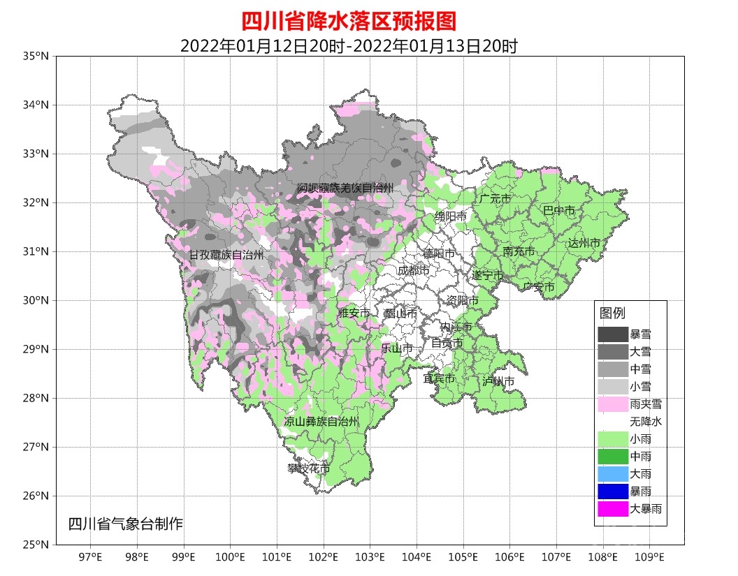 預(yù)計12日晚上到13日白天,盆地各市陰天,部分地方有小雨或零星小雨,西部北部高海拔地區(qū)有雨夾雪;川西高原和攀西地區(qū)陰天間多云有陣雪(雨),局部地方有中到大雪。