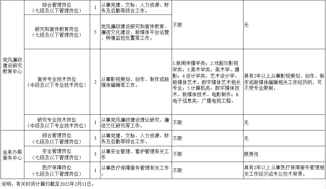 考調(diào)事業(yè)人員25名。其中,信息技術(shù)中心管理崗位9名,黨風(fēng)廉政建設(shè)研究教育中心管理崗位6名、專業(yè)技術(shù)崗位3名,金泉辦案服務(wù)中心管理崗位7名。