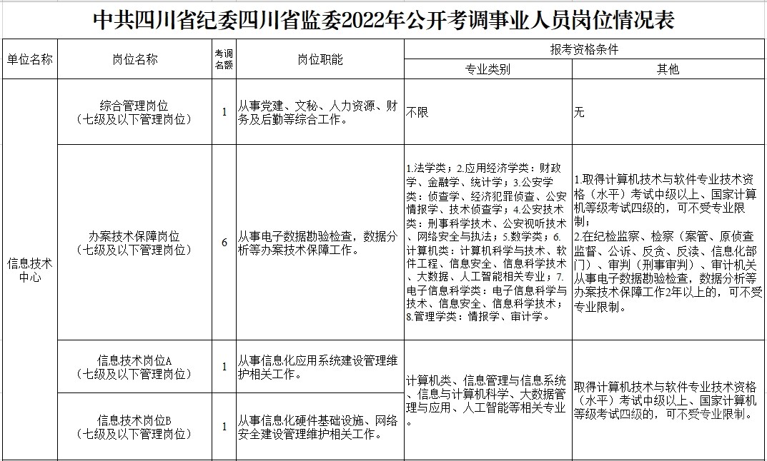 符合報考崗位規(guī)定的資格條件,詳見《中共四川省紀(jì)委四川省監(jiān)委2022年公開考調(diào)事業(yè)人員崗位情況表》(附后)。