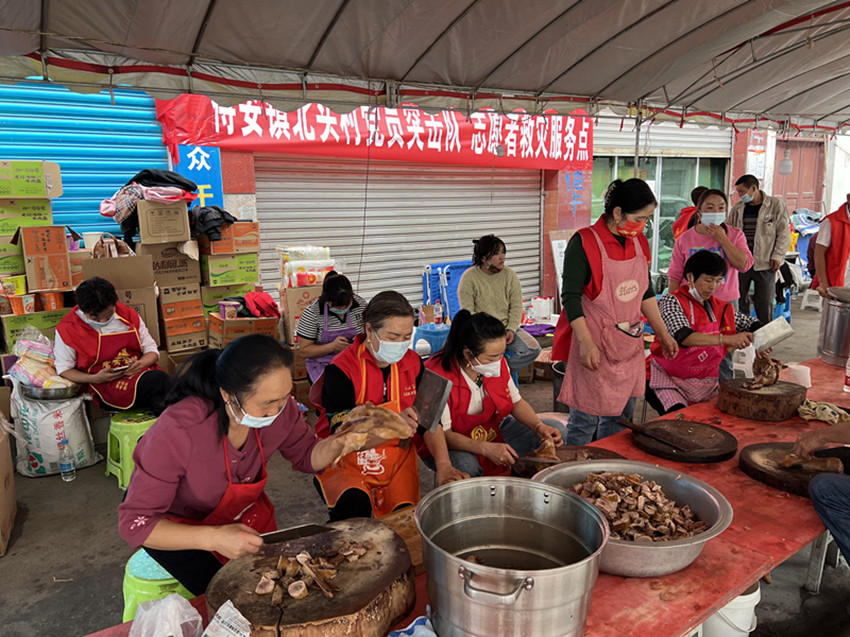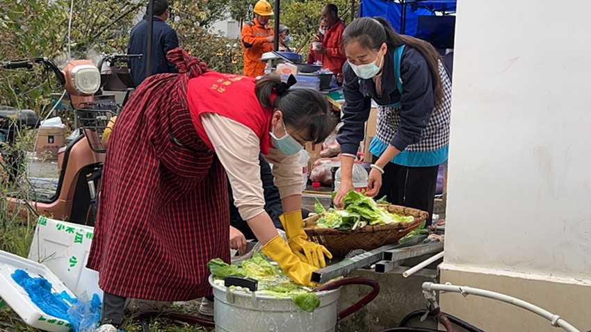 在得妥鎮(zhèn)北頭村的路旁,來(lái)自瀘定縣冷磧鎮(zhèn)桐子林村的李星芳和其他志愿者一起忙著切菜煮飯。她告訴記者,地震發(fā)生后,我主動(dòng)報(bào)名加入志愿者團(tuán)隊(duì)?!拔覀冞@個(gè)點(diǎn)上除了政府發(fā)放的物資,還有很多附近村民和好心人送來(lái)的菜肉和水果,大家都在用自己的行動(dòng)出一份力。”正在忙著切菜的志愿者洪衛(wèi)群說(shuō)。就在記者采訪時(shí),在北頭村開(kāi)飯館的易姝宏一家送來(lái)了鹵菜、排骨和新鮮蔬菜,記賬員茍有成忙著清點(diǎn)數(shù)量并記錄在冊(cè)?!暗卣鸷?,爸媽把年邁的奶奶送到瀘定縣城孃孃家,我也向單位請(qǐng)了假,今天我們一起趕回來(lái)在這里幫忙”。