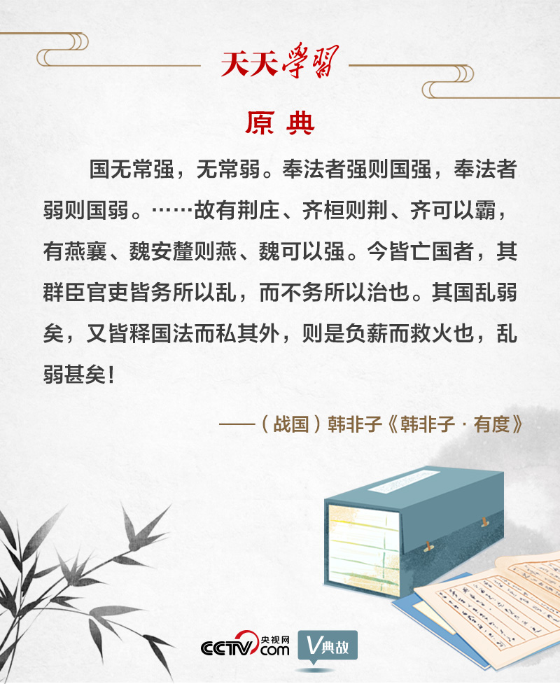 韓非子是戰(zhàn)國時(shí)期法家思想的集大成者。“有度”,就是有法度。韓非子把“奉法”作為治亂興亡的關(guān)鍵,提出“國無常強(qiáng),無常弱。奉法者強(qiáng)則國強(qiáng),奉法者弱則國弱”。意思是,國家不會(huì)永遠(yuǎn)富強(qiáng),亦不會(huì)長久貧弱。執(zhí)行法度的人堅(jiān)決,國家就會(huì)富強(qiáng);執(zhí)行法度的人軟弱,國家就會(huì)貧弱。