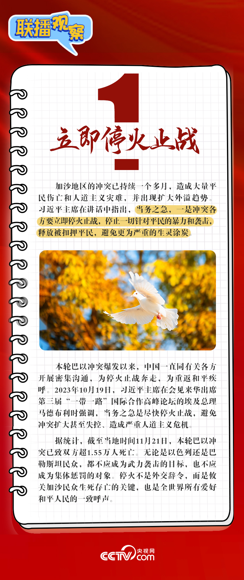 11月21日晚,中國國家主席習(xí)近平出席金磚國家領(lǐng)導(dǎo)人巴以問題特別視頻峰會并發(fā)表重要講話,呼吁沖突各方立即?;鹬箲?zhàn)。中方呼吁盡快召開更具權(quán)威性的國際和會,凝聚國際促和共識,推動巴勒斯坦問題早日得到全面、公正、持久解決。