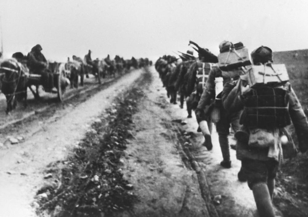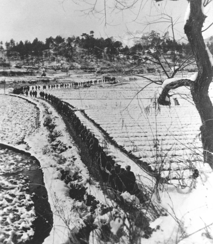 ↑ 抗日戰(zhàn)爭(zhēng)期間,新四軍在蘇北冰天雪地中行進(jìn)。