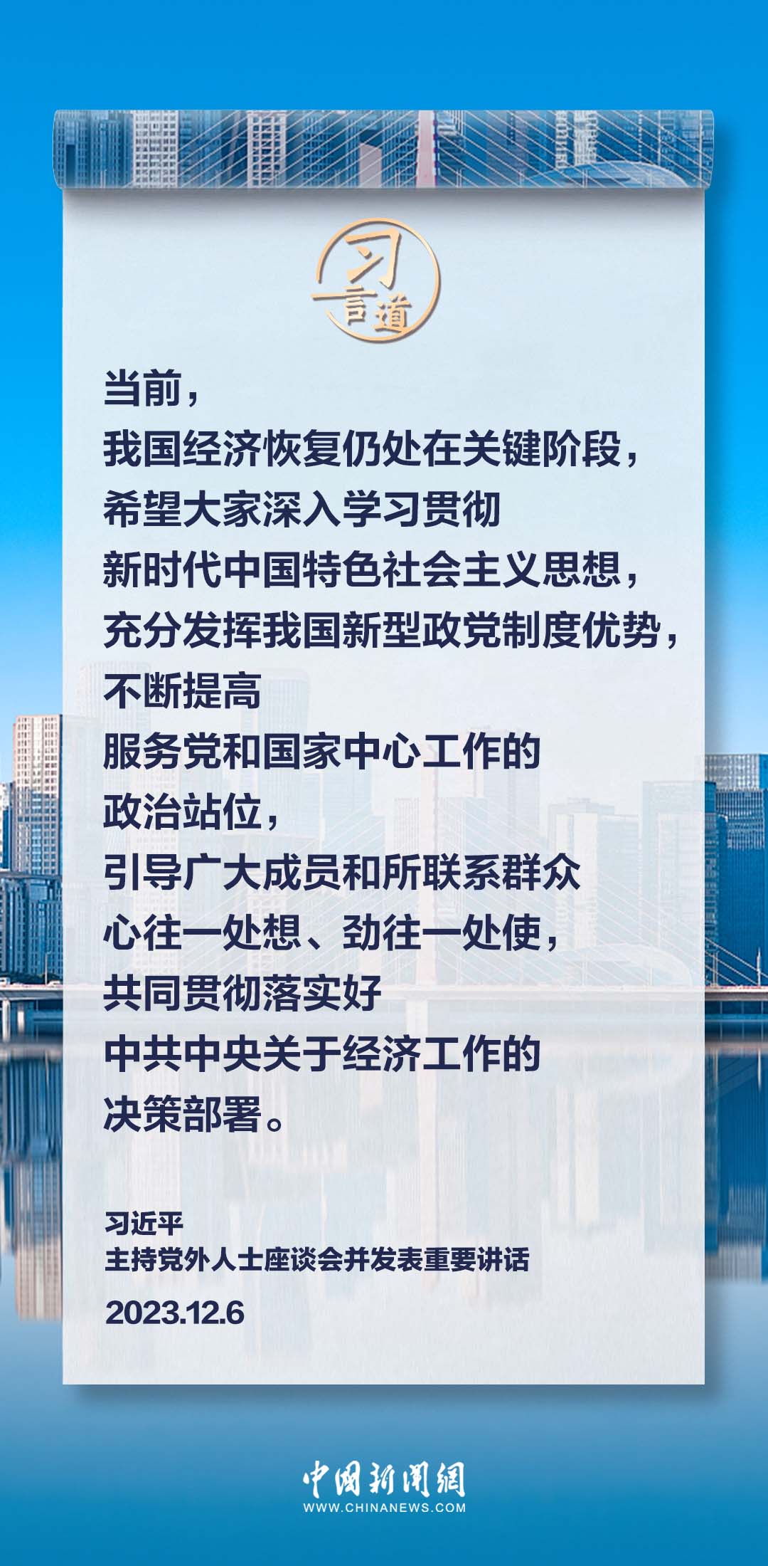 12月6日,中共中央在中南海召開(kāi)黨外人士座談會(huì),就今年經(jīng)濟(jì)形勢(shì)和明年經(jīng)濟(jì)工作聽(tīng)取各民主黨派中央、全國(guó)工商聯(lián)負(fù)責(zé)人和無(wú)黨派人士代表的意見(jiàn)和建議。中共中央總書(shū)記習(xí)近平主持座談會(huì)并發(fā)表重要講話(huà)。