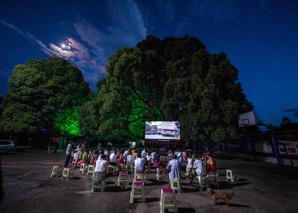 村民在菜花坪鎮(zhèn)菜塘村弄堂文化廣場觀看電影。(譚德樂 攝)
