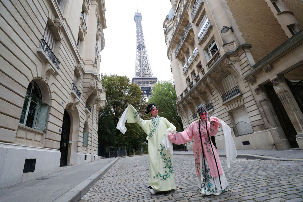 2023年9月13日,江蘇省演藝集團(tuán)昆劇院院長施夏明(左)和江蘇省演藝集團(tuán)昆劇院國家一級(jí)演員孔愛萍在法國巴黎埃菲爾鐵塔附近參加昆曲快閃。新華社記者 高靜 攝
