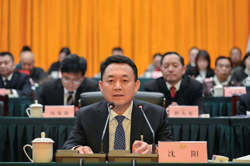 1月29日,甘孜藏族自治州第十三屆人民代表大會(huì)第三次會(huì)議、政協(xié)甘孜藏族自治州第十四屆委員會(huì)第三次會(huì)議在康定開幕,州委書記沈陽(yáng)出席開幕會(huì)。圖為沈陽(yáng)在州政協(xié)十四屆三次會(huì)議開幕會(huì)上講話。賴強(qiáng) 甲央讓布 攝
