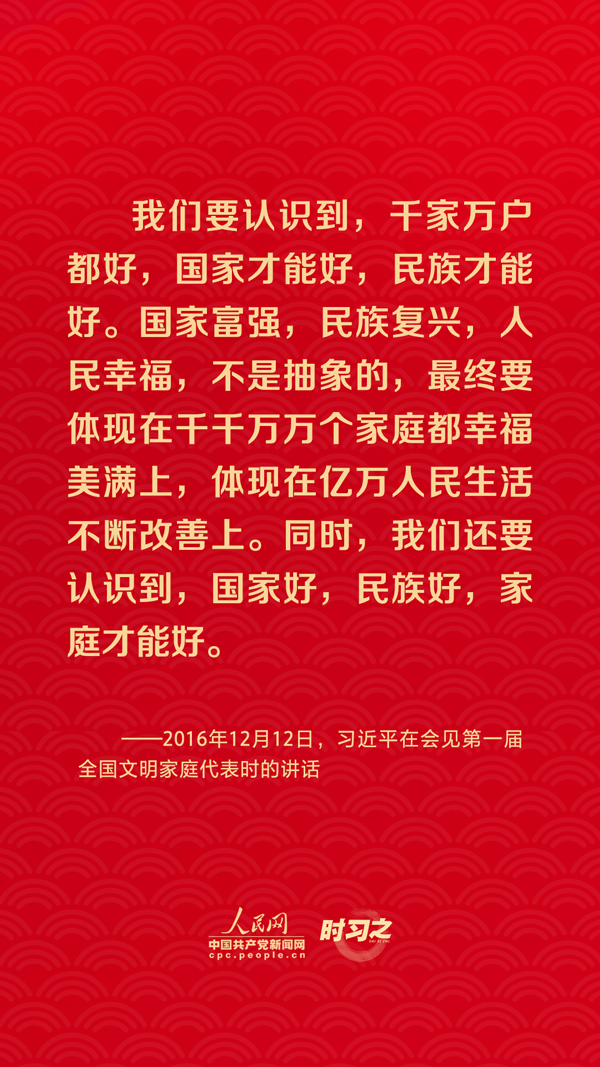 團(tuán)圓是春節(jié)永恒的主題?!皼](méi)有國(guó)家繁榮發(fā)展,就沒(méi)有家庭幸福美滿(mǎn)。同樣,沒(méi)有千千萬(wàn)萬(wàn)家庭幸福美滿(mǎn),就沒(méi)有國(guó)家繁榮發(fā)展?!绷?xí)近平總書(shū)記曾在多個(gè)場(chǎng)合深刻闡述家庭與國(guó)家之間的關(guān)系,從他的話(huà)語(yǔ)里一起感悟深厚的家國(guó)情懷。