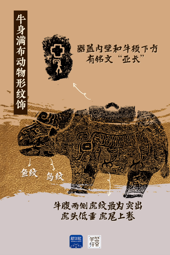??亞長(zhǎng)牛尊是截至目前殷墟發(fā)現(xiàn)的唯一一件牛形青銅容器?!皝啞笔俏涔俚姆Q謂,“長(zhǎng)”是家族姓氏,墓主人亞長(zhǎng)是商王朝南部“長(zhǎng)”國(guó)的部落首領(lǐng)。