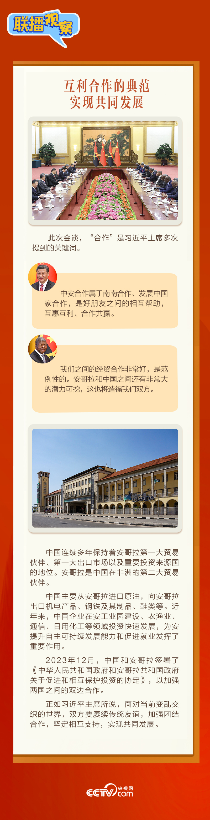 聯(lián)播+3月15日,習(xí)近平主席在人民大會(huì)堂同來(lái)華進(jìn)行國(guó)事訪問(wèn)的安哥拉總統(tǒng)洛倫索舉行會(huì)談。會(huì)談中,習(xí)主席稱洛倫索總統(tǒng)為“中國(guó)人民的老朋友”,評(píng)價(jià)中安關(guān)系“歷經(jīng)國(guó)際風(fēng)云變幻考驗(yàn),實(shí)實(shí)在在造福了兩國(guó)人民”。