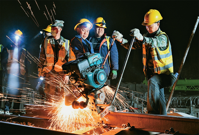 2024年4月10日,在內(nèi)蒙古包頭市,包銀高鐵引入包頭樞紐工程的關(guān)鍵控制性工程之一——包西上行線路撥接完成施工。此次施工完成,標(biāo)志著包銀高鐵引入包頭樞紐包頭站改造工程取得重大進展,為包銀高鐵開通奠定堅實基礎(chǔ)。圖為4月10日凌晨,工人在包西上行線路上作業(yè)。 新華社記者 劉磊/攝
