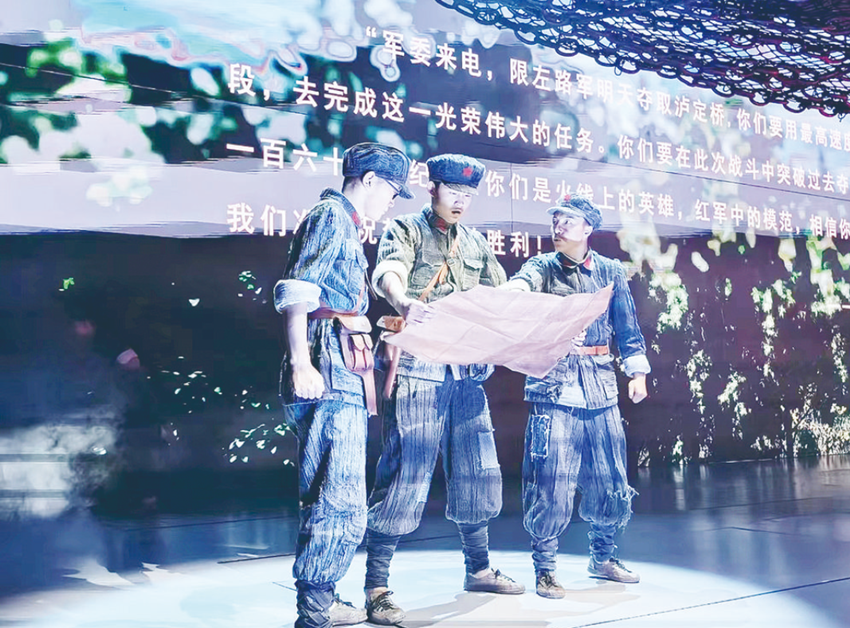 “同志們,跟我前進(jìn)!”“以最快速度趕到瀘定橋,才是我們的首要任務(wù)……”舞臺(tái)大幕開(kāi)啟,影像結(jié)合舞美形成一組巨型浮雕,在燈光的映照下,紅軍戰(zhàn)士堅(jiān)毅的臉龐漸漸浮現(xiàn),他們佇立在瀘定橋旁,目光如炬。燈滅,炮火聲從遠(yuǎn)處傳來(lái)……這是大型原創(chuàng)舞臺(tái)劇《飛奪瀘定橋》中的場(chǎng)景,每天上午10時(shí)30分和下午3時(shí),該劇在瀘定縣紅軍飛奪瀘定橋紀(jì)念碑公園內(nèi)的紅軍劇場(chǎng)上演。偉大的長(zhǎng)征是中國(guó)共產(chǎn)黨和紅軍譜寫(xiě)的壯麗史詩(shī),是中華民族偉大復(fù)興歷史進(jìn)程中的巍峨豐碑。舞臺(tái)劇《飛奪瀘定橋》聚焦宏大歷史中的典型事件,以紅軍長(zhǎng)征途中飛奪瀘定橋戰(zhàn)役為背景,以一個(gè)紅軍小號(hào)手的視角,生動(dòng)講述紅四團(tuán)晝夜奔襲240里,22名突擊隊(duì)員在槍林彈雨中踩著13根鐵索成功奪下瀘定橋的故事,藝術(shù)展現(xiàn)紅軍的堅(jiān)定革命信念和必勝信心,讓觀眾在感動(dòng)中重溫偉大長(zhǎng)征精神。