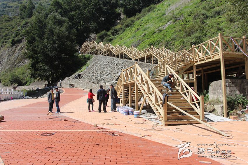 據(jù)該項目管理人員介紹,該條環(huán)山路,全長2公里左右,山路中還設(shè)計了一個較大的亭子,以這個亭子為中心,上通南無寺,下至將軍橋康定賓館處。其中有兩條階梯式藏式長廊與白土坎村的阿里布果游道相連接。在工作人員的引領(lǐng)下,筆者來到公主橋附近的項目地,遠眺階梯長廊,就像一條黃龍蜿蜒在密林里,給情歌之城再添一抹神秘色彩。