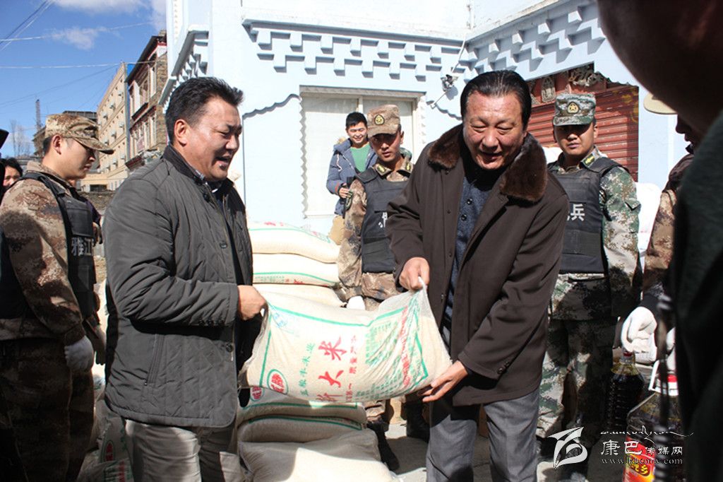 州政協(xié)副主席、縣委書記阿基布珠(右),縣委副書記、縣長旦燈(左)發(fā)放救災(zāi)物資。