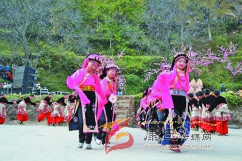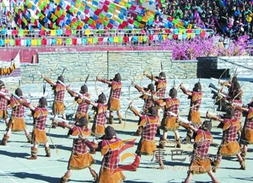 10月26日,在甲居藏寨,處處洋溢著豐收和歡樂的氣氛,人們扶老攜幼,身著節(jié)日的盛裝走到一起,來共同慶祝丹巴嘉絨風情節(jié)的順利召開。在一塊空地中,搭建了臨時的舞臺,看臺上,幾座古碉模型傲然挺立,在不遠處,一座古碉矗立在一座小山包上,與古碉模型遙相呼應、相映成趣。上午9時40分,當節(jié)目主持人宣布嘉絨風情節(jié)正式開始時,一束束搖曳的煙花向空中飛去,在空中炸響后,散發(fā)出五顏六色的煙霧,其中有的還幻化成幾多小小的降落傘,就像多多盛開的鮮花在空中綻放。演出現(xiàn)場前的大地和遠處的小山坡上到處都站滿了熱情的觀眾,合著禮花的爆裂時的響聲,將手中的小紅旗展開,高舉過頭頂,有節(jié)奏的左右搖動,霎時間,整個現(xiàn)場成為了紅色的海洋。
