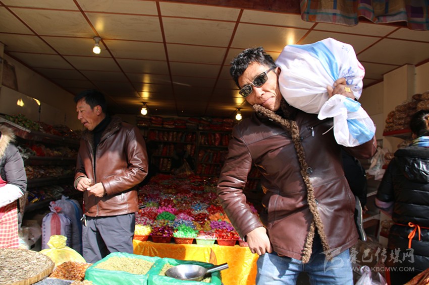 走進郭達橋重康糖果店,洛讓說:“多買點糖果糕點,娃娃老婆喜歡?!比缓笳諉吸c貨:花生10斤、瓜子5斤、葡萄干5斤、水果糖5斤、軟糖5斤、炒米糖10斤……一下就指點了八九種糖果糕點??吹搅诉@樣的生意,老板樂開了花。與洛讓大包大攬的氣派不同,長期經(jīng)商的扎西老練地詢價:“老板,我們買這么多,要優(yōu)惠喲。”一番討價還價之后,洛讓和扎西買了十種糖果,用去1066元,裝滿整整兩編織袋。洛讓把糖果過扛在肩上,對筆者說:“你來試一下,有點分量,你別說,辦年貨也是一種體力活喲?!?/p>