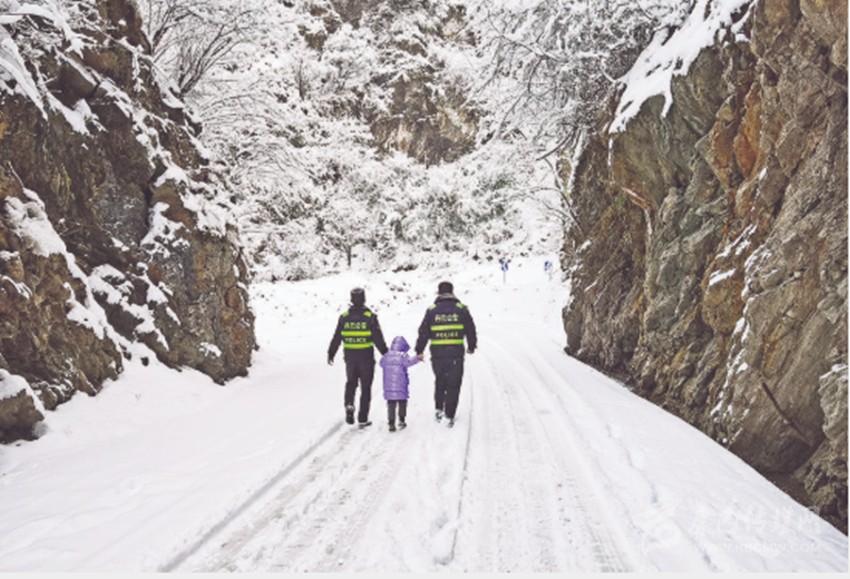 晨間,山谷滿是積雪,氣溫已降至零下??吹巾旓L冒雪如期而至的民警,原本又驚又怕的受困游客看到了希望??陆鹳F和戰(zhàn)友們一方面安撫他們,另一方面合力將事故車輛移開,并帶領受困人員安全離開事發(fā)區(qū)域。