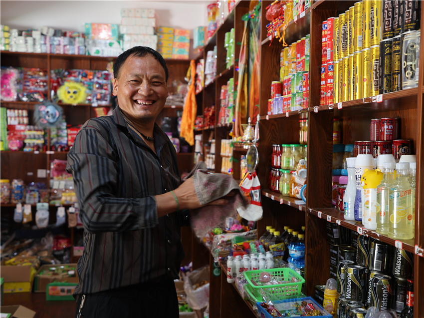 一大早,村民彭措就開始忙里忙外的收拾著小超市和茶樓,掃地、拖地、擦拭商品……每一個環(huán)節(jié)他都做得一絲不茍,他所打理的這個小超市和茶樓是村里的集體經(jīng)濟之一,每個季度都由村民們輪流負(fù)責(zé)日常經(jīng)營。這個不大的村子共有4個組67戶327人,每個季度從四個組中安排三戶村民負(fù)責(zé)村集體經(jīng)濟的運營。