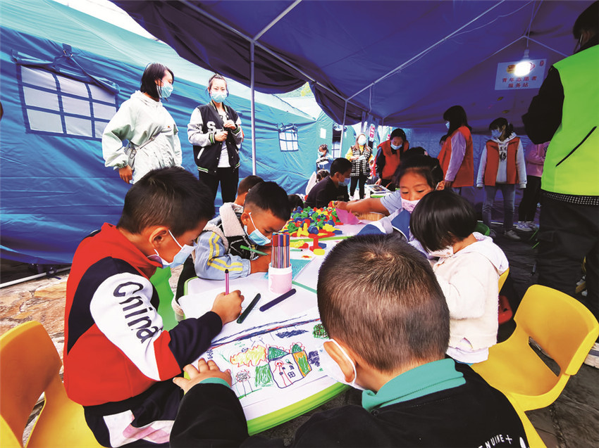 “這頂帳篷中充滿了孩子們的歡聲笑語(yǔ),這在地震災(zāi)區(qū)就是最動(dòng)聽(tīng)的聲音?!惫睬鄨F(tuán)甘孜州委統(tǒng)戰(zhàn)社會(huì)聯(lián)絡(luò)部部長(zhǎng)澤仁娜姆介紹,地震發(fā)生后,團(tuán)州委第一時(shí)間組織3193名志愿者,24支青年突擊隊(duì)參與應(yīng)急志愿者工作,并在磨西鎮(zhèn)貢嘎廣場(chǎng)分配38名志愿者參與后勤保障工作,其中5個(gè)人便成為了“青青兒童樂(lè)園”里的“保育員”,“孩子們可以在這里畫(huà)畫(huà)、做游戲,還能在老師輔導(dǎo)下學(xué)習(xí),他們不安的情緒也得到安撫,臉上的恐懼也逐漸被微笑取代?!?/p>