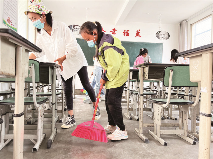 在學(xué)校一樓走廊,記者看到墻壁上貼滿了孩子們自制的民族團(tuán)結(jié)手抄報(bào)和五十六個(gè)民族一家親的畫作。瀘定橋小學(xué)副校長杜德琴告訴記者,這是學(xué)校開展鑄牢中華民族共同體意識主題教育實(shí)踐活動(dòng)的內(nèi)容之一?!斑@些都是老師、家長和學(xué)生一起完成的,‘團(tuán)結(jié)’與‘奮進(jìn)’已深深印刻在瀘定橋小學(xué)每一個(gè)人的言行中,我們是愛的傳遞者,我們是在以實(shí)際行動(dòng)踐行校訓(xùn)。我希望災(zāi)區(qū)的孩子們能盡快走進(jìn)學(xué)校,繼續(xù)學(xué)業(yè)。”