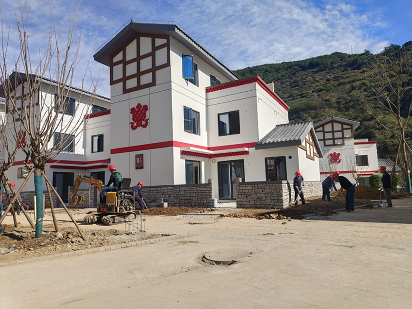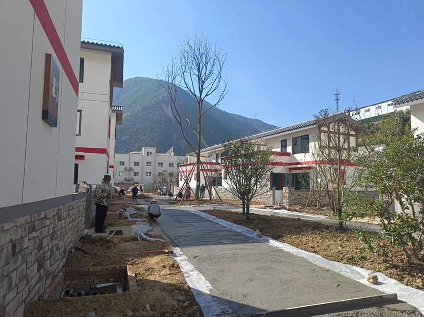 11月5日,記者走進瀘定縣德威鎮(zhèn)奎武村“9·5”瀘定地震災后重建集中安置點,只見一幢幢繪有“如意結”和穿斗裝飾等瀘定傳統(tǒng)建筑元素以及“瀘定紅”“紅飄帶”等民族特色的安置房沿大渡河畔依次排開,一條條寬敞平整的水泥硬化道路將這些風貌一致、戶型合理、結構安全的安置房屋串聯(lián)起來。幾十名工人正在安置點內(nèi)忙碌,有的在鋪設路面、有的在栽種綠化樹、有的在搬運廢渣……,拿到鑰匙的部分村民正在進行室內(nèi)裝修,現(xiàn)場一派繁忙景象。