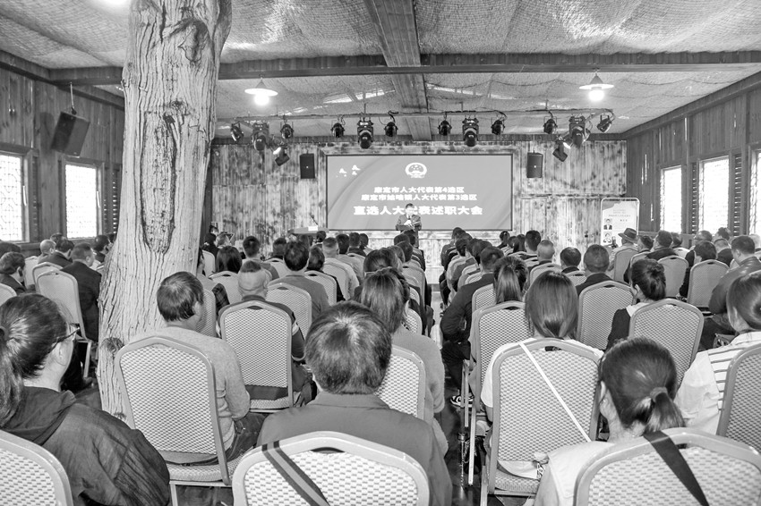 圖為參會(huì)人員現(xiàn)場(chǎng)觀摩康定市人大代表述職大會(huì)。