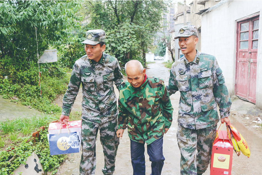 尚巴曲扎(左)與戰(zhàn)友看望老人。