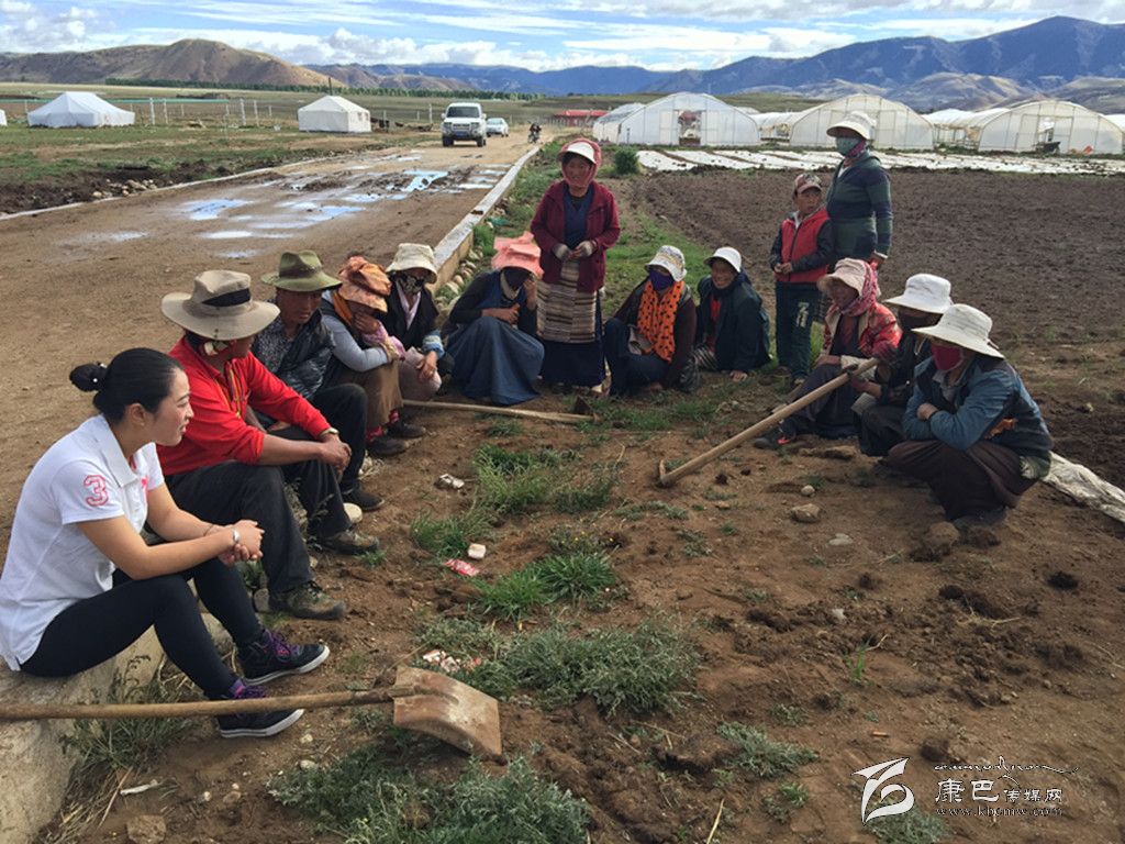 鄉(xiāng)黨委書記使朗擁忠(左一)了解村民在圣地農(nóng)莊打工及學(xué)習(xí)蔬菜種植情況︒ 葉強(qiáng)平 攝