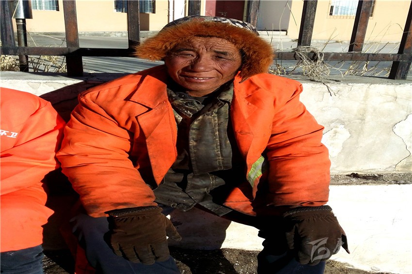 春節(jié)快到了,石渠的最低氣溫已低至零下20余攝氏度,在這呵氣成霜、滴水成冰的季節(jié),大街小巷卻仍然能看見身穿橙色工作服還在起早貪黑地辛勞工作著的人們,他們就是石渠的環(huán)衛(wèi)工人。年近60的澤仁羅布便是其中的一員,雖然他雙頰已被風(fēng)霜刻畫出道道溝壑,但身體卻很硬朗,閑暇的時候他喜歡和大家在工作的附近找一處陽光充足的地方曬曬太陽、聊聊天。