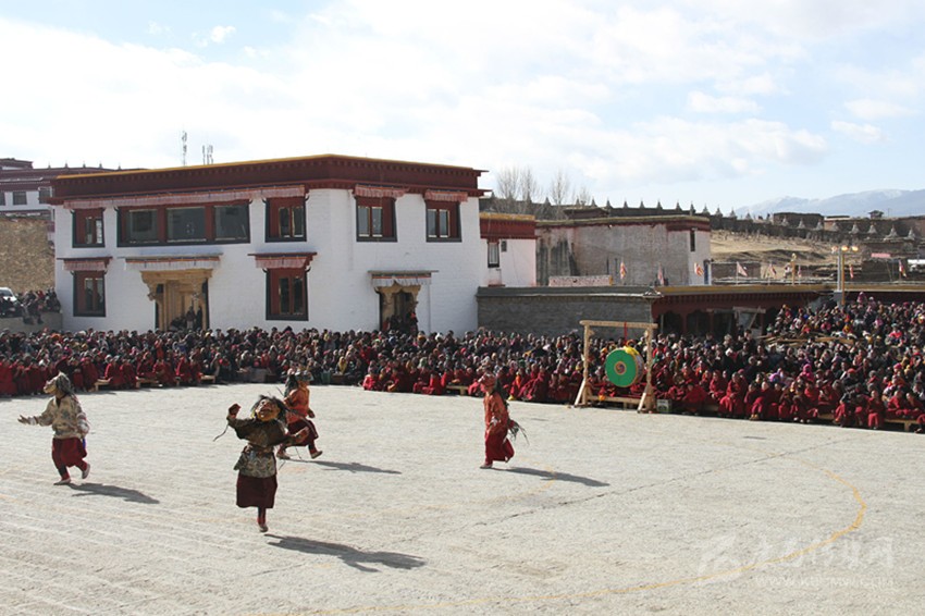 2月25日,是藏歷的12月29日,理塘縣長青春科爾寺舉行了盛大的“古多”儀軌活動。僧人在寺廟廣場表演“羌姆”,各區(qū)鄉(xiāng)鎮(zhèn)農(nóng)牧民群眾近萬人匯聚于此,觀看表演?!扒寄贰币鉃樘瘢遣貍鞣鸾讨腥谧诮绦?、藝術(shù)性為一體的法舞儀式,本地藏族群眾又稱其為“巴羌”,即“面具法舞”,寄寓了人們辭舊迎新、禳災祈福的美好愿望。