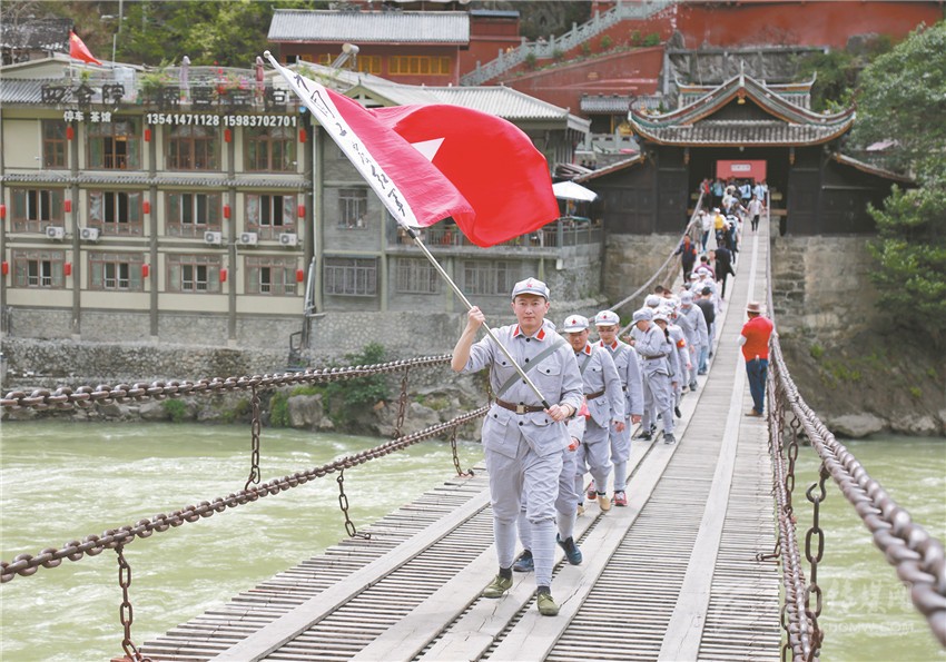 紅色培訓(xùn)小分隊(duì)追尋長(zhǎng)征足跡,行進(jìn)在瀘定橋上。