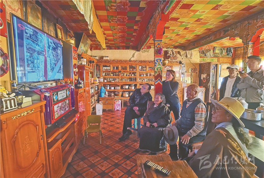 石渠牧民貢洛和家人在家中收看慶祝大會電視直播。
