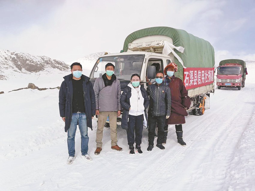 石渠縣信用社員工冒著漫天大雪為群眾捐贈(zèng)蔬菜。
