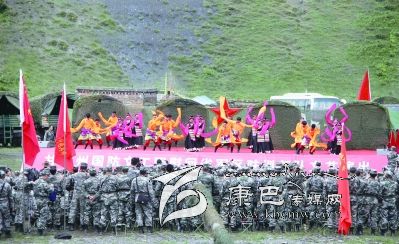 慰問演出在獨(dú)立營(yíng)戰(zhàn)士的拉歌聲中徐徐拉開帷幕,隨后,《北京的金山上》、《我的士兵兄弟》等一首首耳熟能詳?shù)母枨鹨簧涎荨!稓g歌踏舞》、《盛世歡歌》等舞蹈,時(shí)而歡快跳躍,時(shí)而雄壯豪邁,歌曲《說句心里話》唱出了官兵的思念之情,也唱出了官兵們保家衛(wèi)國(guó)的心聲。整場(chǎng)演出在舞蹈《康巴人》中落下帷幕。
