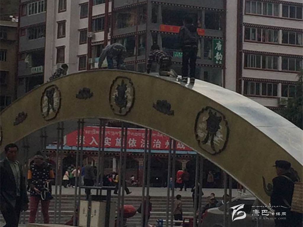 在康定劇場(chǎng)前面的廣場(chǎng)上,每天傍晚,廣場(chǎng)舞大叔大媽都準(zhǔn)時(shí)前來報(bào)到。孩子們則在人群中玩耍。7歲的陽陽(化名)被奶奶帶著來到廣場(chǎng)上學(xué)習(xí)滑旱冰,滑著滑著小伙伴出現(xiàn)了。脫掉冰鞋,陽陽和大家一起開始在“康定情歌”歌譜造型的漢白玉雕塑上攀爬。奶奶則在廣場(chǎng)另一端和老友擺龍門陣,根本無暇顧及。“征服”了“康定情歌”以后,陽陽和伙伴們繼續(xù)“征服”康定劇場(chǎng)臺(tái)階前的大塊漢白玉雕塑。“趕快下去,這些娃娃真沒得家教!”一位愛管閑事的中年人制止了孩子們的“不文明”行為。他離開后,陽陽再次奔向漢白玉雕塑……