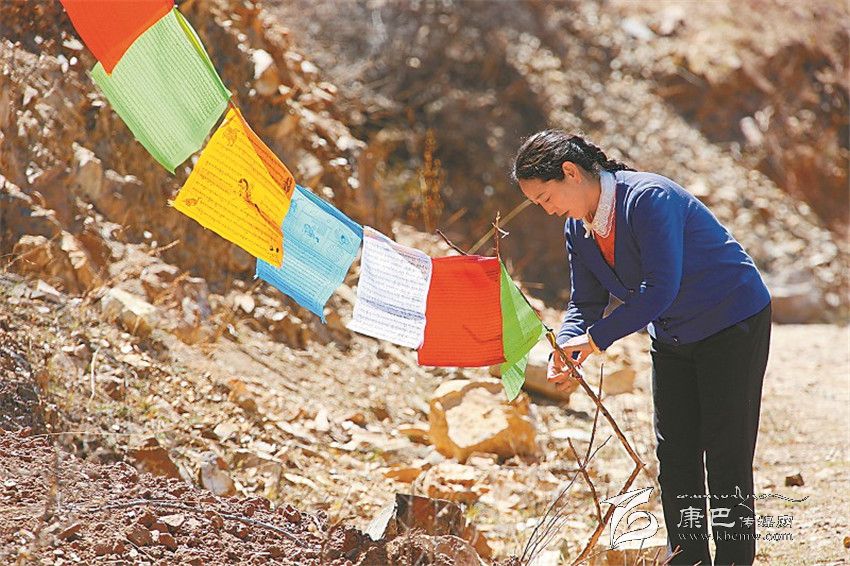 到達益西村布乃格時,杜勒突然發(fā)現(xiàn)前面有十多米路段已經(jīng)被洪流沖垮了一半。“停車!停車!不能再往前開了!”坐在副駕駛座上的杜勒急忙叫住丈夫,從身上斜挎的小包里拿出五六面風馬旗,拉開車門,幾步?jīng)_到了垮塌路段跟前。“不要再過去了,水里有石頭,一會兒被大水沖走了你就完了!”仁孜跟著跳下車,追著她喊??墒嵌爬詹活櫿煞虻暮艉?,蹲在垮塌路面的邊緣,伸出雙手將穿滿風馬旗繩子的一端系在路邊山壁的樹枝上。她身子傾斜,右腳伸直踩在被河水沖成斜坡的路基上,左腳彎曲踏著僅剩的一點路面,想將繩子綁得更加牢固。而風馬旗卻不聽使喚的在風雨交加中搖擺不定,杜勒心中此刻只有一個信念:風馬旗上系著的是萬千生命,無論如何也要綁牢實。“你是不是瘋了?路基都空了,要是垮下去你被大水沖走了怎么辦?”仁孜話音剛落,杜勒右腳踩著的那塊泥土突然整塊塌了下去。仁孜一把抓住她的手臂,把她拽了上來。“如果當時是她一個人,那肯定沒命了!”仁孜把她拖回車上才發(fā)現(xiàn),杜勒卷起褲管兒的腿上布滿了青青紫紫的淤痕,雙腳顫顫巍巍,幾乎站不穩(wěn)。回到縣城后,醫(yī)生告訴杜勒短時間內(nèi)不能走路,要多休息??墒?,當天下午,杜勒趁仁孜上班,自己找了一根竹棍子拄著,又趕到下一個坍塌路段做著重復的工作。