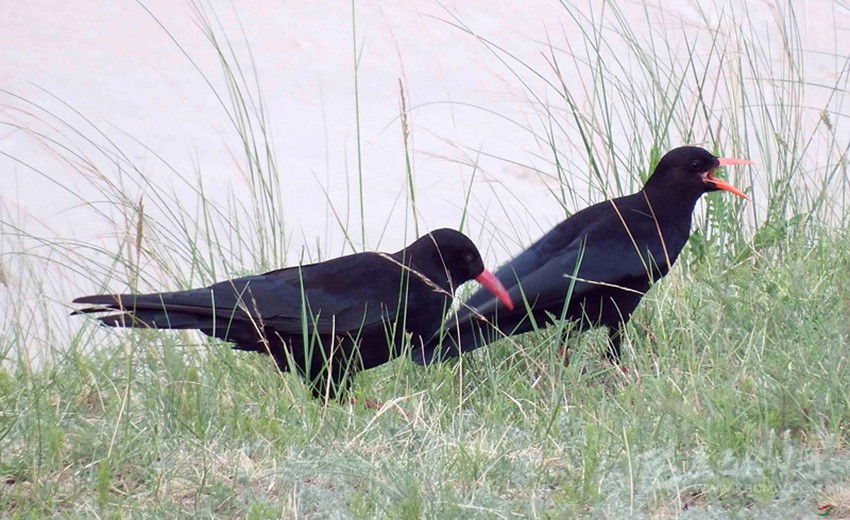 離開養(yǎng)老院,隊(duì)員們沿著小路漫步時,看見了大量的巖羊、狼和狐貍的糞便。當(dāng)隊(duì)員們正在十分愜意地欣賞著這里的美景時,隊(duì)員老蔣突然站在一塊巖石上大呼小叫起來,因?yàn)橐恢桓咴脧乃磉吪苓^,嚇了一跳。隊(duì)員們隨著高原兔跑過的方向,抬頭向那陡峭的崖壁張望,希望能看到巖羊或雪豹的蹤跡,然而只看見一群紅嘴山鴉在追逐著一只乘風(fēng)盤旋的胡兀鷲。