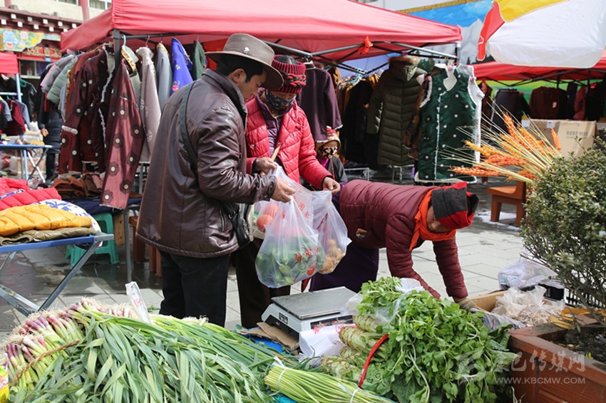 記者看到,集市上圍滿了背著背簍采購(gòu)年貨的群眾,他們有的拿著新款式的藏裝比來(lái)比去,有的對(duì)著圖案豐富的藏毯左挑右選,有的在購(gòu)買(mǎi)商品“犒勞自己”,有的在為后輩“獻(xiàn)著愛(ài)心”,大家都在選購(gòu)著心儀的年貨。